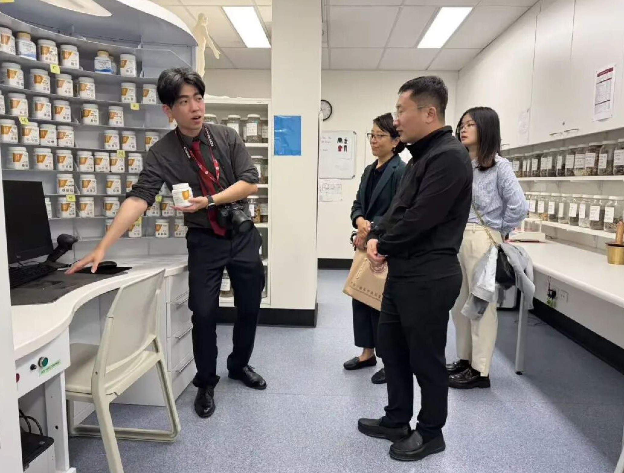 西悉尼大学中医专业研究生、中医学生会主席、中澳中医中心行政助理邱之杰为代表团讲解草药颗粒剂处方的配制流程